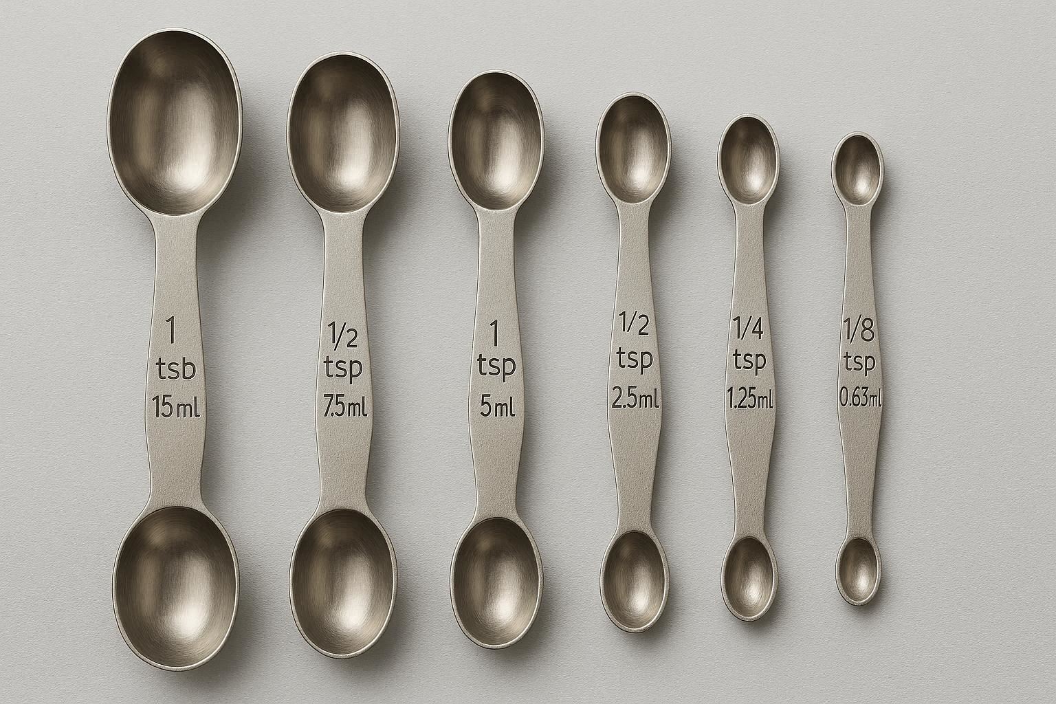 The set includes measurements from 1/8 teaspoon to 1 tablespoon, covering all your basic measuring needs. The spoons have comfortable, ergonomic handles that are easy to grip, and they??re stackable for convenient storage. They??re dishwasher safe for easy cleanup, and their sleek, modern design makes them a stylish addition to any kitchen. Whether you??re baking a cake or cooking a meal, these double sided measuring spoons will make your tasks easier and more efficient.