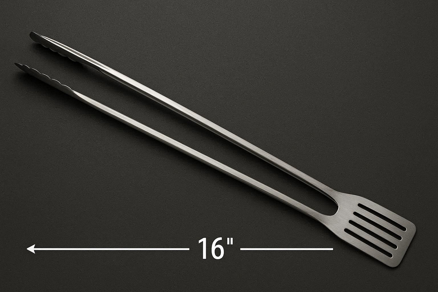 These extra long 16-inch food tongs provide maximum safety and reach for grilling, deep frying, and cooking over open flames. The extended length keeps your hands far away from heat and splatters, while the heavy-duty stainless steel construction ensures durability and stability. The serrated tips offer a strong grip on large cuts of meat, whole chickens, and bulky vegetables, making them perfect for outdoor grilling and commercial kitchen use.